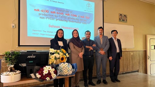 جلسه دفاع از پایان نامه آقای بهنام حسن‌زاده دانشجوی مقطع کارشناسی ارشد ژنتیک انسانی روز شنبه مورخ ۱۴۰۴/۰۶/۲۹ رأس ساعت ۱۴ در محل کلاس ۲۰۴ با حضور دانشجویان و جمعی از اساتید برگزار شد. موضوع پایان نامه ایشان “ ارزیابی میزان بیان miRNA های miR-6130 , miR-6165 ، miR-1246 و miR-532-5p در سلول های اندوتلیال تولید کننده فاکتور ۸ انعقادی در مقایسه با سلول های اندوتلیال غیر تولید کننده ( Evaluating the expression of miR-6130 , miR-6165 , miR-1246 and miR-532-5p by FVIII-producing versus non-FVIII producing endothelial cells)” بود و استاد راهنمای ایشان در این پروژه خانم دکتر شاهانی بودند.