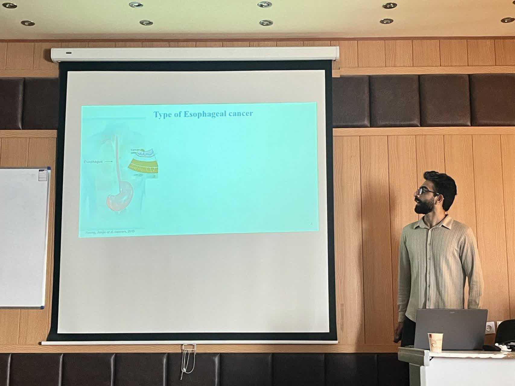 گزارش پیشرفت کار پایان نامه آقای سبحان حسن پور دانشجوی مقطع کارشناسی ارشد ژنتیک انسانی روز یکشنبه مورخ ۱۴۰۴/۰۴/۲۹ رأس ساعت ۹ًصبح با حضور دانشجویان و اساتید گروه در محل سالن رازی برگزار شد. عنوان پایان‌نامه ایشان “ Investigation of the expression of the Circular Non-coding RNA (circ-SOX2) and its association with the pluripotency gene SOX2 in esophageal adenocarcinoma cell lines “ با راهنمایی خانم دکتر خلیلی می‌باشد.
